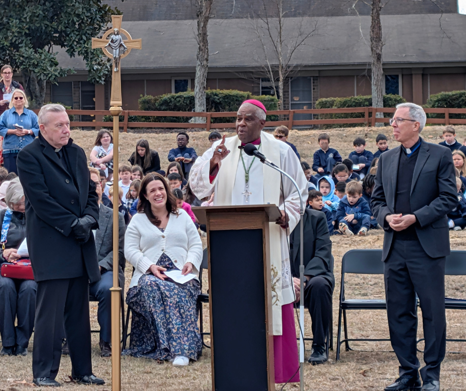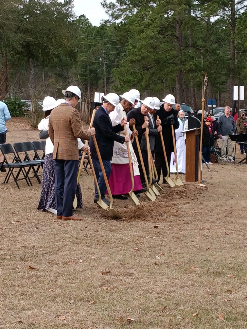 On March 2, 2026, our parish community gathered with the Most Rev. Jacques Fabre‑Jeune, Bishop of Charleston, to break ground for the new church building on our school campus. Bishop Fabre‑Jeune offered a blessing over the land and shared words of encouragement as we began this long‑awaited project.