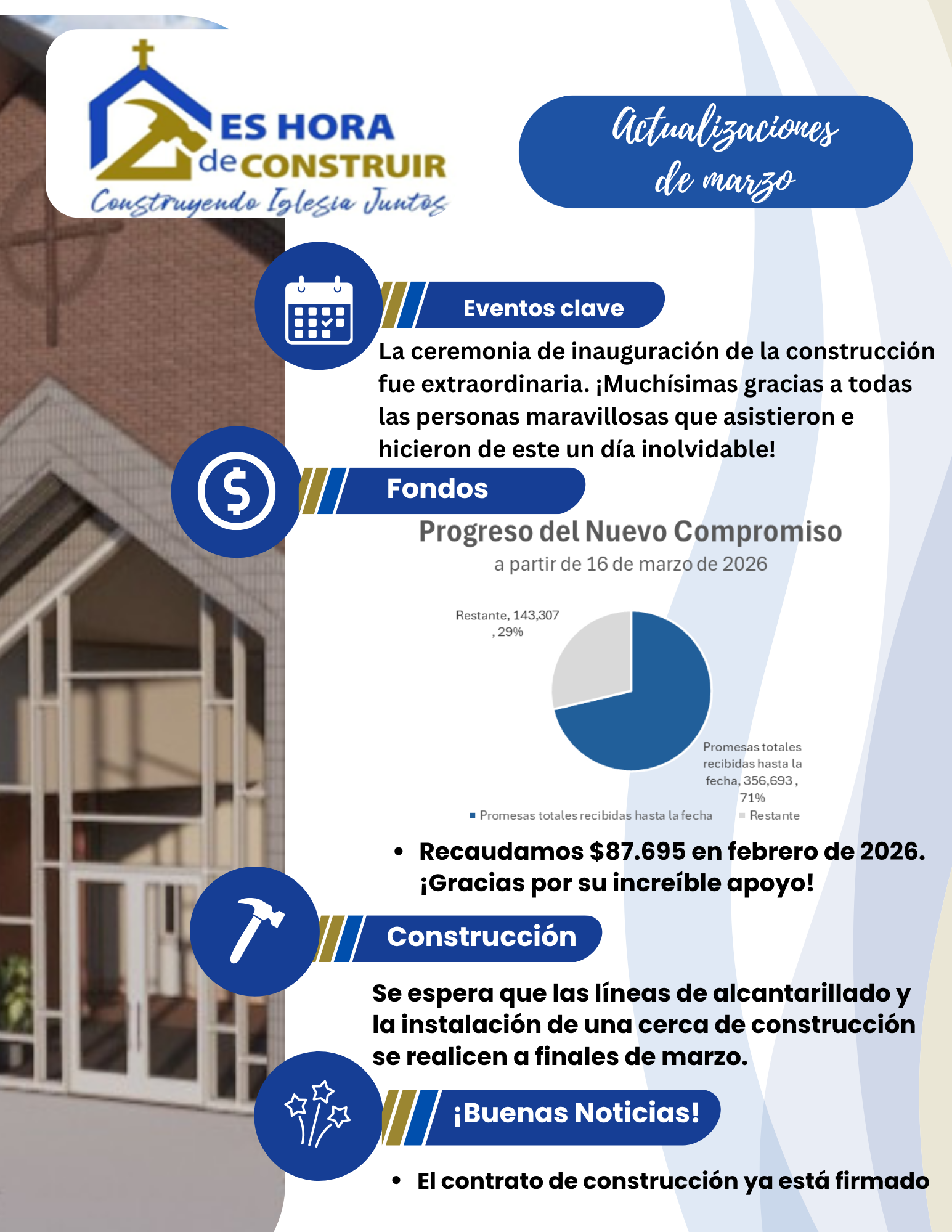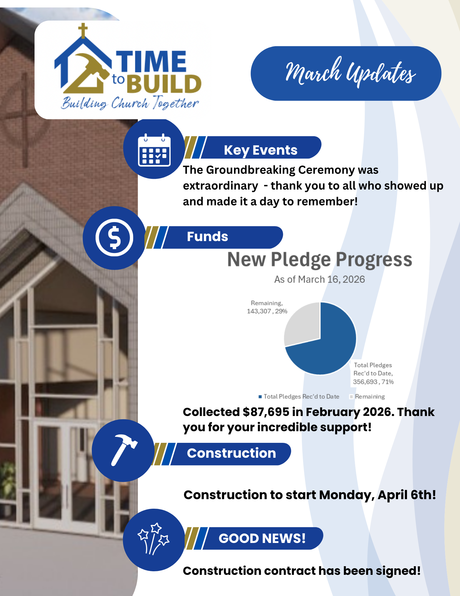 Get ready for an exciting update! As summer fades and school gears up, so are our plans for the new church. The best part? We've hit our $3 million baseline goal for the Time to Build Campaign, and the Diocese gave us the green light in June to move forward with the construction document of the church and hall.